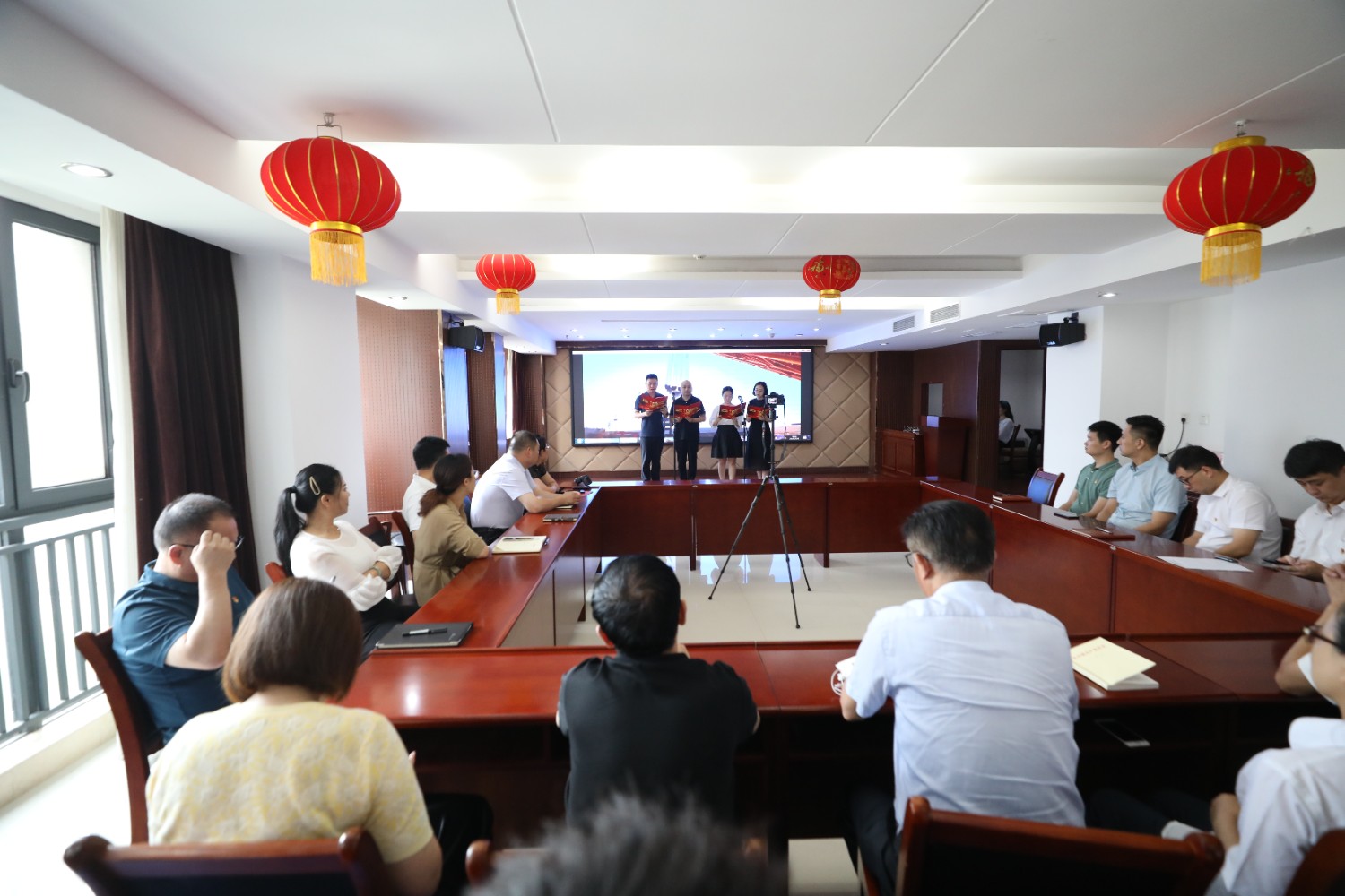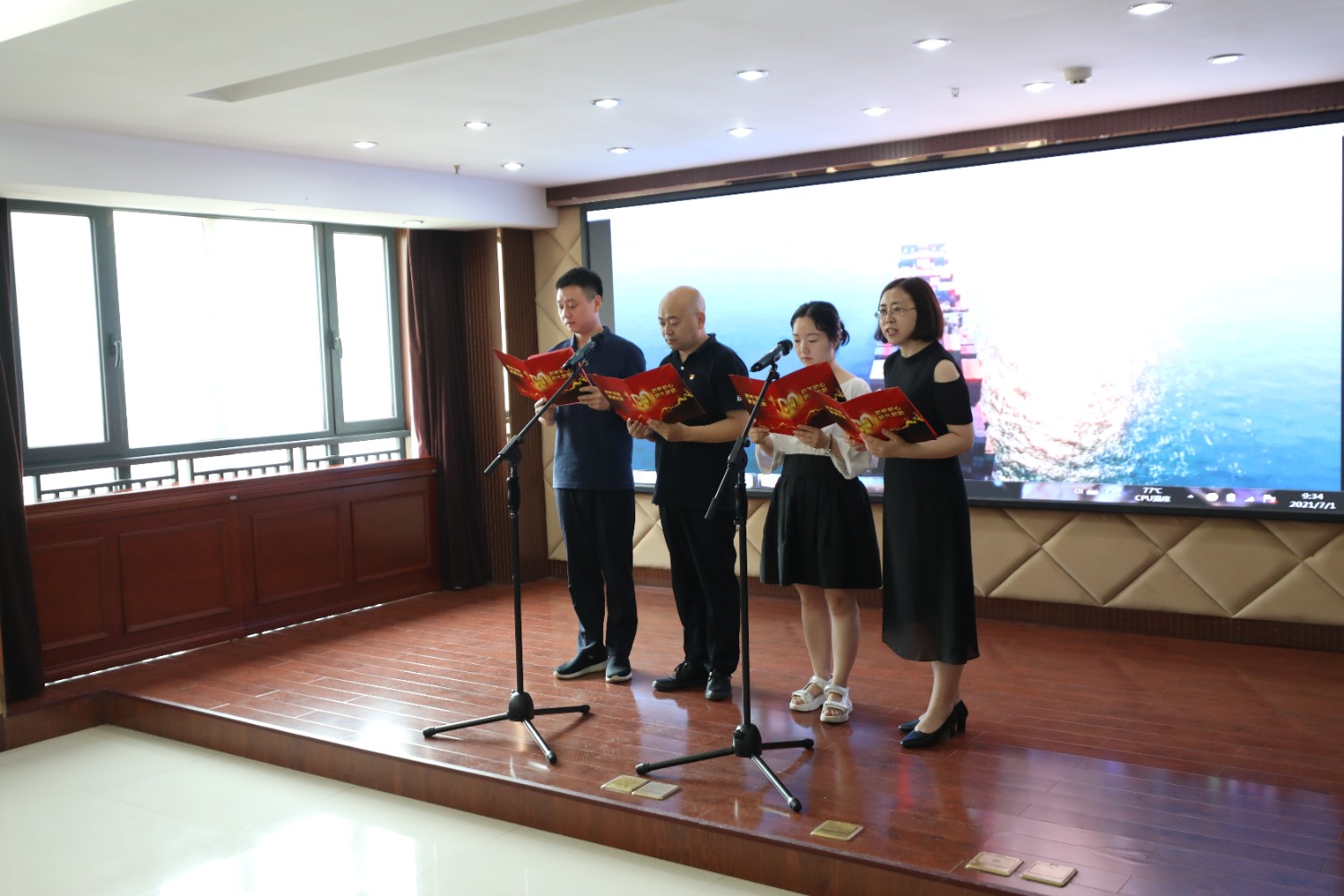 7月1日,在中國共產黨成立100周年的光輝節日里,高速石化公司機關黨員干部群眾在十樓會議室共同觀看《慶祝中國共產黨成立100周年大會》電視直播,并舉辦了慶祝建黨100周年“黨旗在心中飄揚”主題黨日活動。公司領導為7月1日過政治生日的黨員送上了政治生日賀卡和寄語、分享黨史故事;最后,由黨員代表帶來詩朗誦《中國力量》《相約在第一百個春天里》、與會黨員共唱紅歌《沒有共產黨就沒有新中國》,把頌歌和祝福送給親愛的黨。