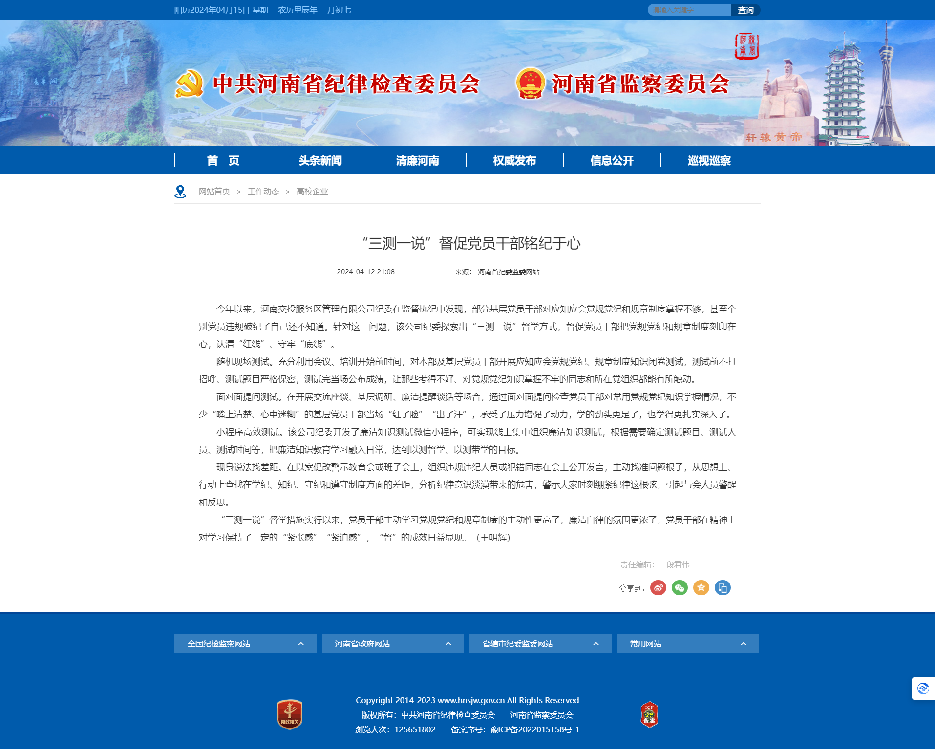 省紀(jì)委監(jiān)委網(wǎng)站刊登公司紀(jì)委文章《“三測(cè)一說(shuō)”督促黨員干部銘紀(jì)于心》