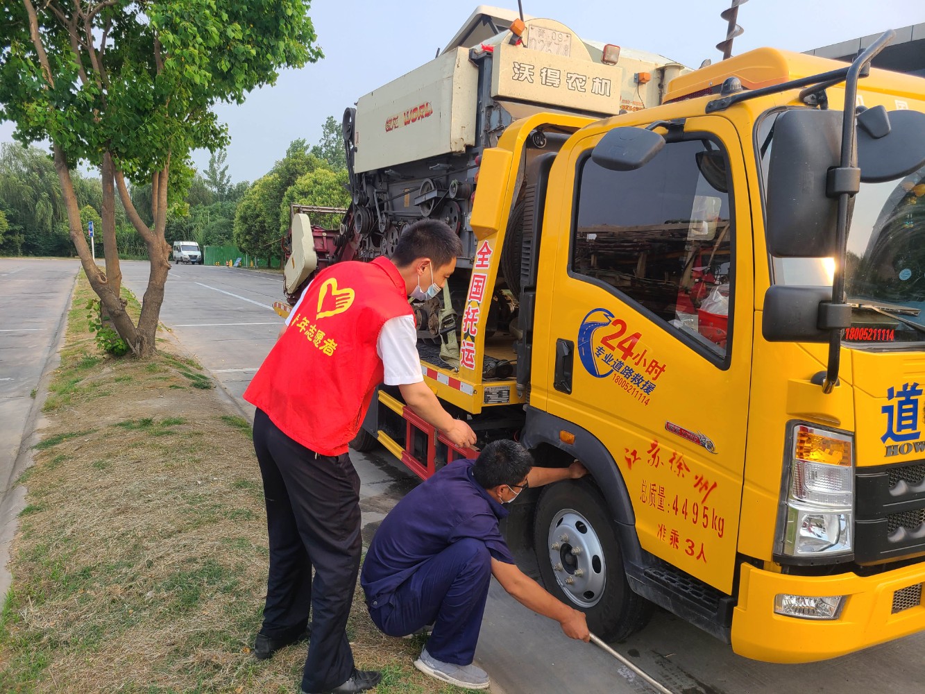 周口東服務區汽修人員義務檢修夏糧收割機。張增利 攝