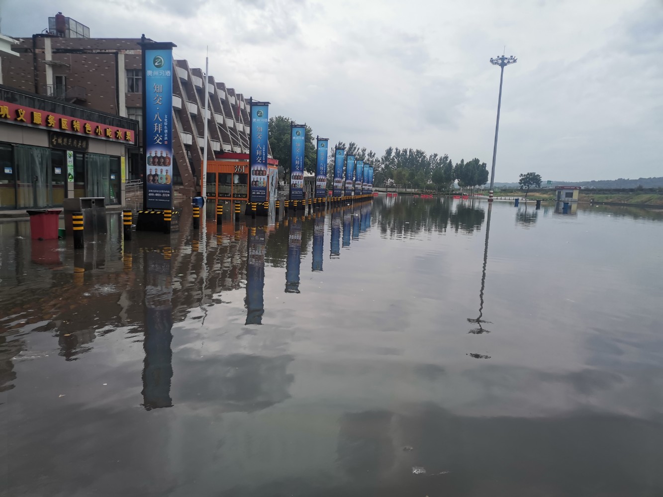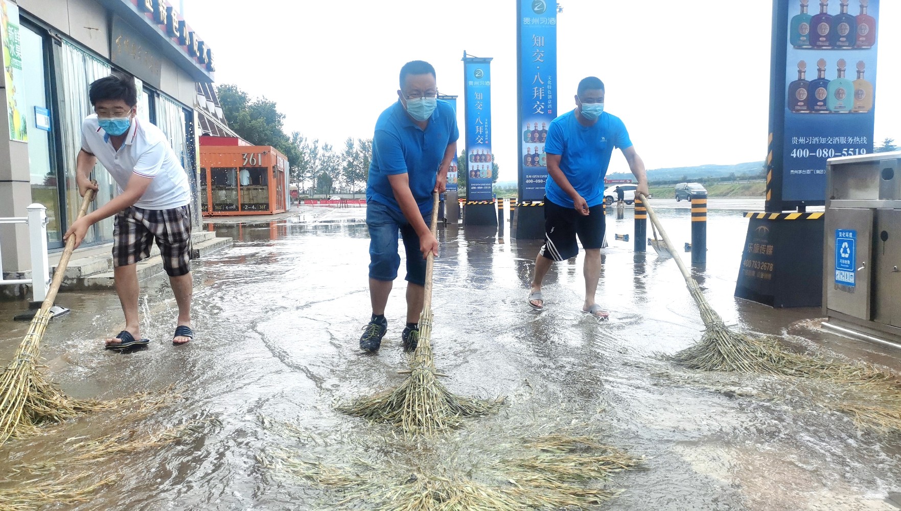 強(qiáng)降雨致鞏義服務(wù)區(qū)南區(qū)廣場(chǎng)積水近30公分,工作人員第一時(shí)間將停留車輛引導(dǎo)至安全區(qū)域,冒雨對(duì)場(chǎng)區(qū)各下水道進(jìn)行疏通,確保積水外排通暢,并通過廣播向司乘普及防汛知識(shí)。同時(shí),對(duì)各功能區(qū)域進(jìn)行仔細(xì)巡查,時(shí)刻關(guān)注北區(qū)瀕臨河流漲勢(shì),充分做好內(nèi)澇、山洪、泥石流等災(zāi)害的防范應(yīng)對(duì),確保及時(shí)掌握受災(zāi)情況、做出應(yīng)對(duì)決策。暴雨漸停后,服務(wù)區(qū)應(yīng)急救援小組及時(shí)組織清理廣場(chǎng)積水、道路淤泥,對(duì)各區(qū)域受災(zāi)情況進(jìn)行排查。下午14:30左右,南區(qū)主樓前積水已清理完畢,為司乘人員安全便捷出行打下基礎(chǔ)。