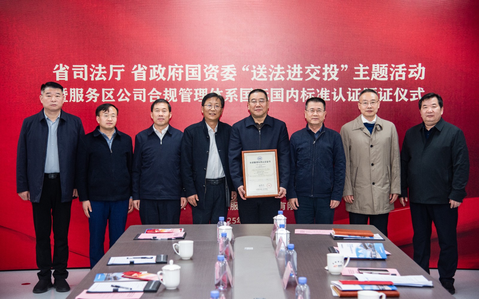 12月4日是第十二個國家憲法日,省司法廳、省政府國資委在集團所屬連霍高速開封服務區聯合開展“送法進交投”憲法宣傳周主題活動暨服務區公司合規管理體系國際國內標準認證頒證儀式。省司法廳二級巡視員武寶山,普法與依法治理處處長楊永峰;省政府國資委黨委委員、副主任劉孟連,研究室處長李會展、副處長李衛敏;中國檢驗認證集團華中區域黨委副書記、常務副總經理胡小鐘,河南公司黨委委員、副總經理任源;交投集團黨委委員、副總經理馬沉重,法律事務部經理劉巍;服務區公司黨委書記、董事長谷源,總經理、黨委副書記、副董事長邱建成,黨委委員、副總經理張帥、閻瑞杰等出席會議。
