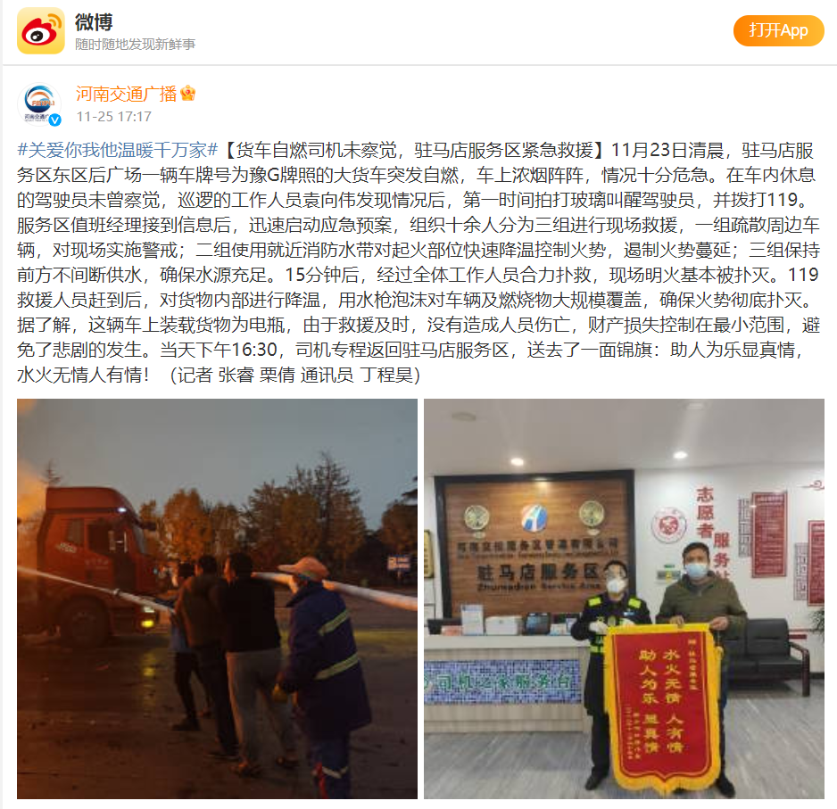 人民日報、今日頭條、微博、大象新聞:貨車自燃司機未察覺 駐馬店服務區(qū)緊急救援(改)