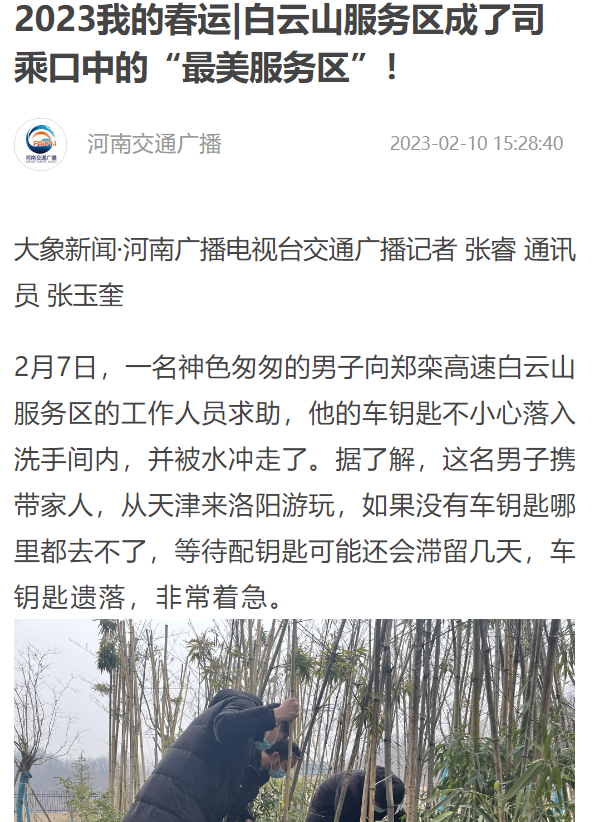 大象新聞、今日頭條、河南交通廣播:2023我的春運|白云山服務區(qū)成了司乘口中的“最美服務區(qū)”?。ǜ模?/p>