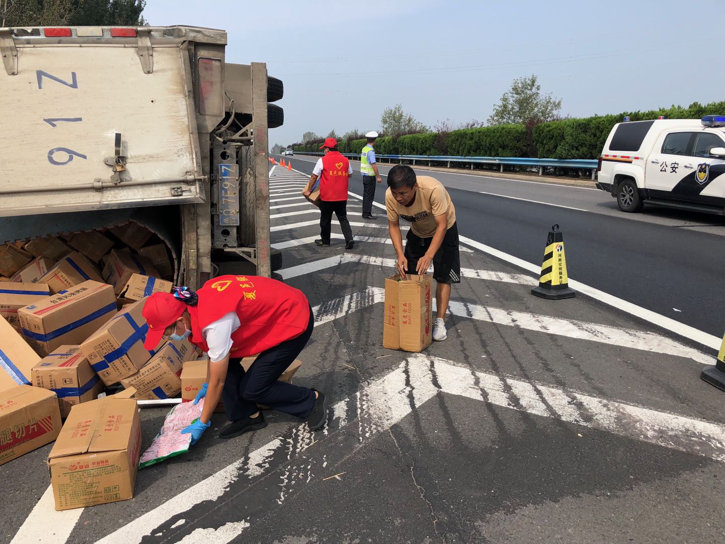 2021-09-15 作者:9月15日,夏邑服務區(qū)值班經(jīng)理在途徑南區(qū)下道口巡查時突然聽見一聲巨響,尋聲遠望發(fā)現(xiàn)下道口上坡處的高速路上兩車相撞,便立即向現(xiàn)場跑去,并撥打電話安排工作人員帶上錐形標前來救援。事故現(xiàn)場一輛貨車車頭損壞,另一輛貨車側翻,所載貨物散落一地,一位駕駛員左臂擦傷,流血不…